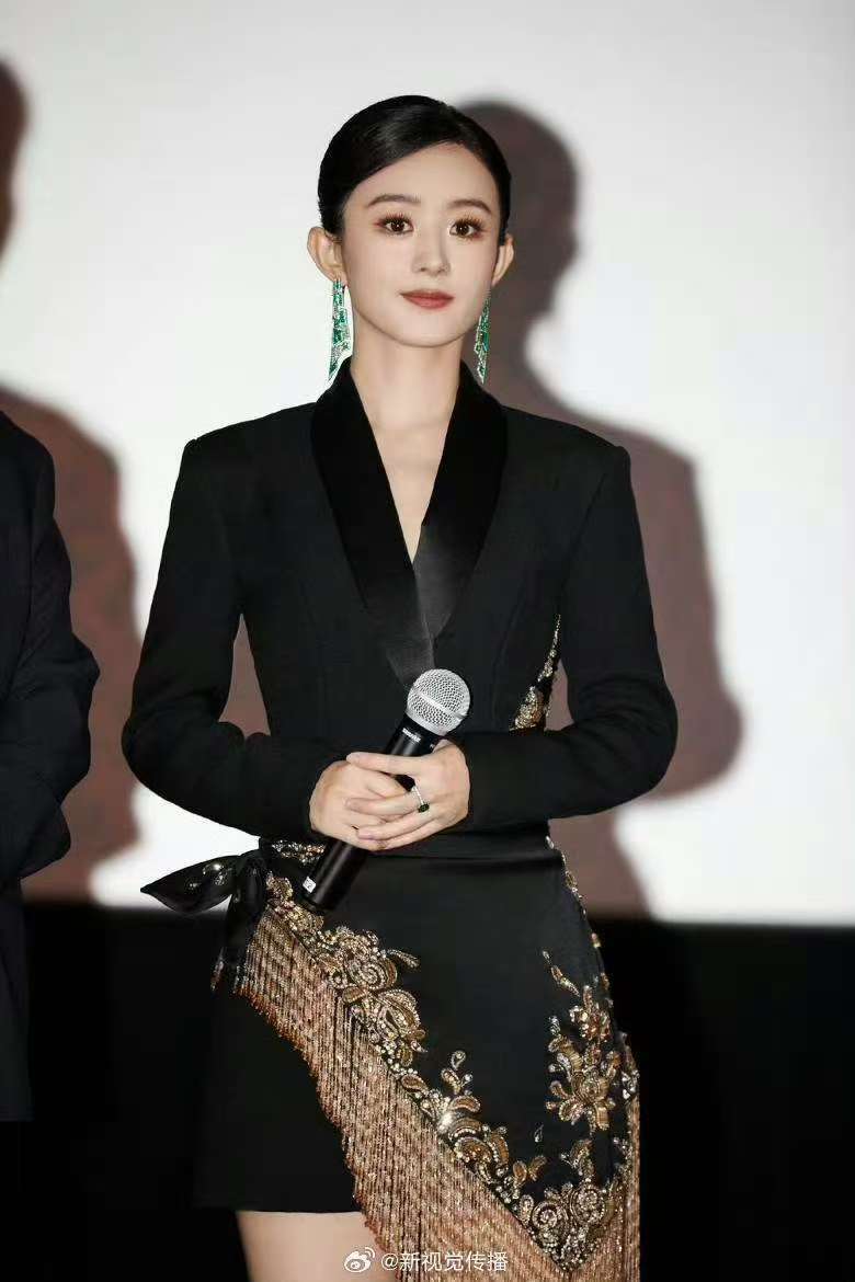穿了一个黑色礼服,气质高贵冷艳,妆容精致,身材依旧是前凸后翘。